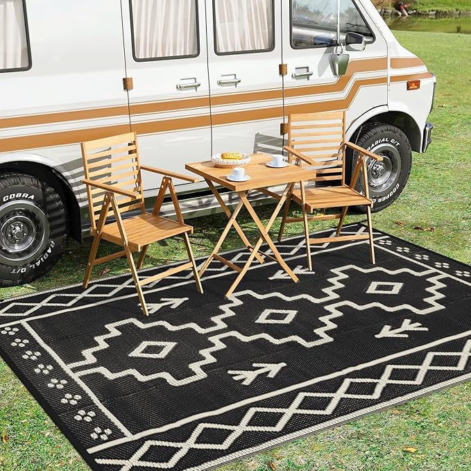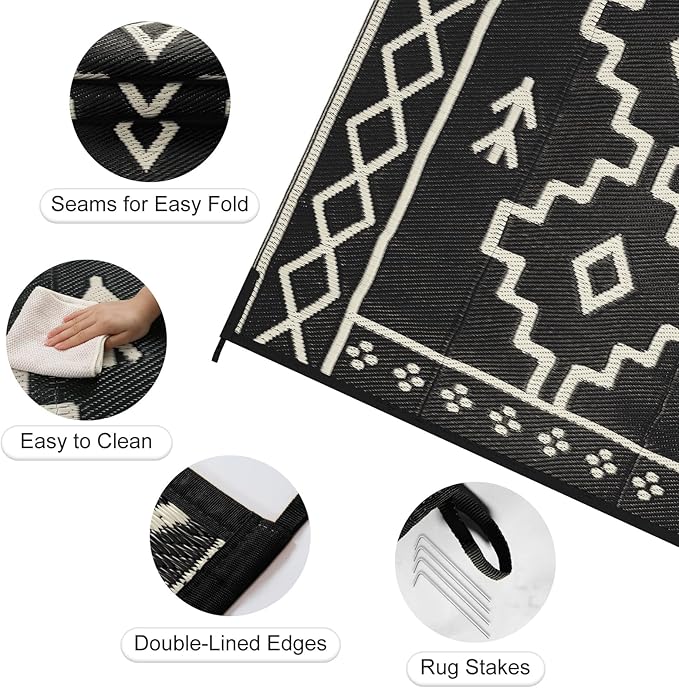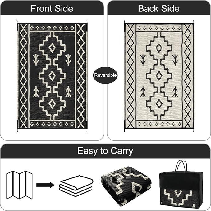 - Reversible and Versatile: This outdoor camping rug is designed with two-sided geometric patterns, if one side is messed up, just flip over to get a new one. It can be widely used in porch, patio, balcony, RV, deck, backyard, camper, balcony, picnic, tent