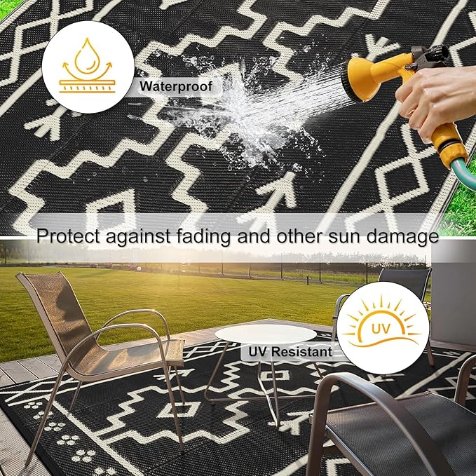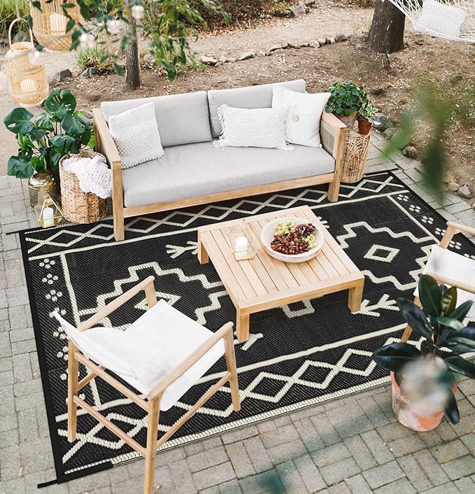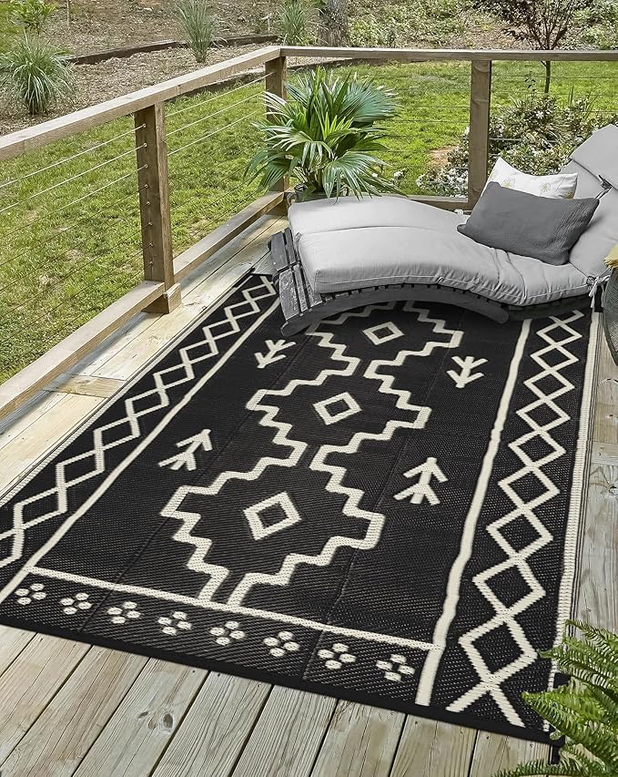 Uphome Outdoor Plastic Straw Rug 6x9 ft, Reversible Waterproof Outdoor Rug Carpet, Black Boho Patio Rug, RV Camping Rug for Outside, Indoor Outdoor Area Rug for Backyard Deck Balcony Picnic, 6'x9'