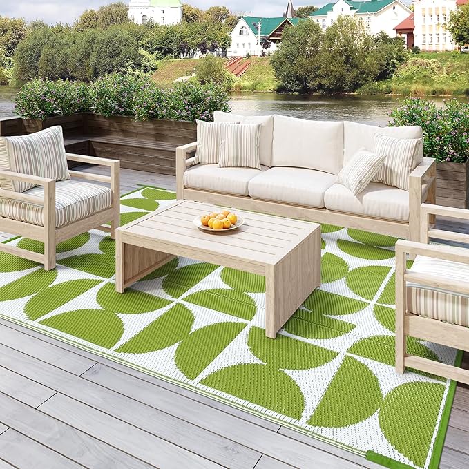 - 【UV-Protected & Reliable】-- Made from recycled plastic, this outdoor rug is finished with a UV-resistant coating that prevents fading and keeps colors vibrant. Reinforced edges ensure durability against heavy foot traffic and harsh weather conditions.