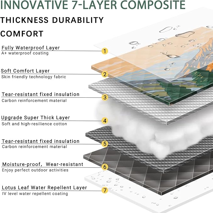 - [7-Layer Structure]This picnic mat features an advanced 7-layer structure design, with a soft cotton layer in the middle that provides excellent cushioning. This ensures a comfortable sitting and lying experience during outdoor activities. Whether you're on grass, sand, or using it indoors, it offers ample support.