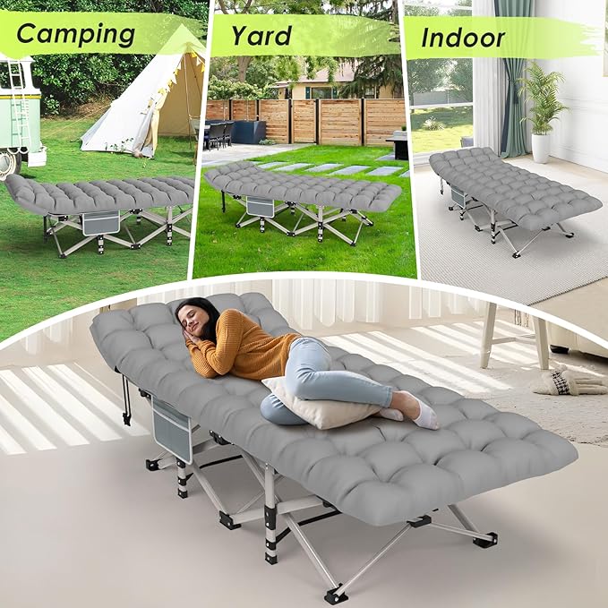- 【Wide Range of Applications】 This camp cot has a large built-in side pocket to store your water bottle, phone, glasses, keys, books, toys, and more. This is a great camping bed for adults and kids. Perfect for camping, road trips, beach, backyard, office naps, and more