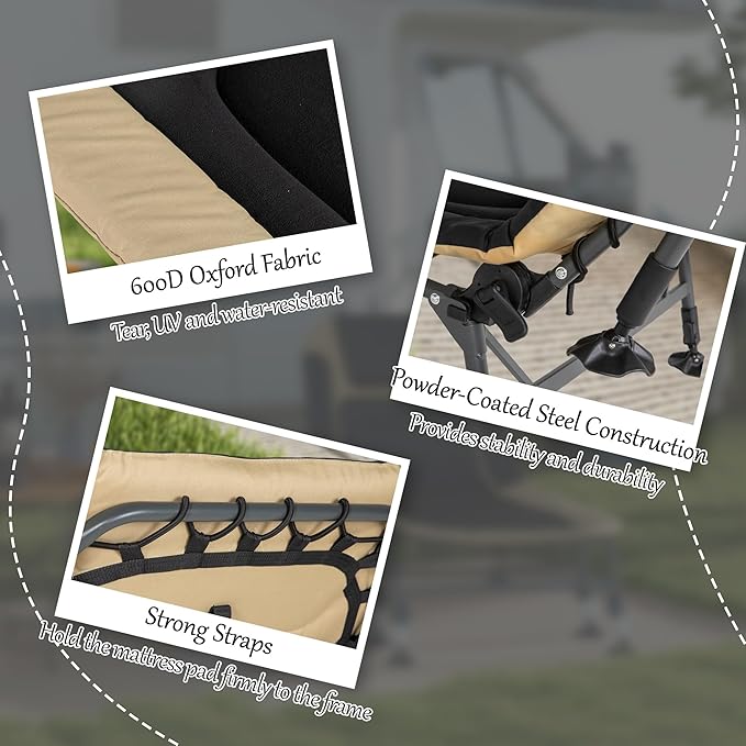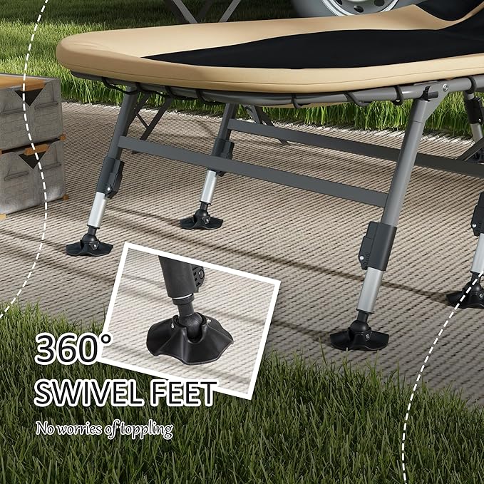 - Camping Ready: Swiveling tripod feet prevent our portable bed from sinking in loose ground. It features a strong steel frame with a powder coat to endure water without issue. Its surface is made of rugged, 600D Oxford fabric, helping it resist tearing when your adventure includes rough conditions.