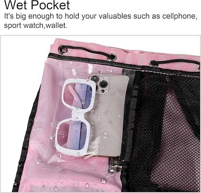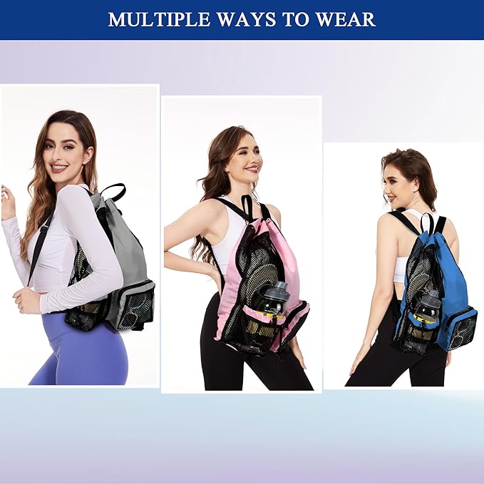 • 🌊ADJUSTABLE STRAP & LARGE CAPACITY -- Our swim bags for swimmers have adjustable shoulder straps that can be adjusted to fit your different needs. Moreover, the backpack design is more convenient, so that your shoulders are more comfortable. This mesh gym backpack measures 18.9 * 13.7 inches and is made of High-Density Oxford, can hold towels, clothes, workout gear, gym gear, swimming gear, sports gear, beach items, and more