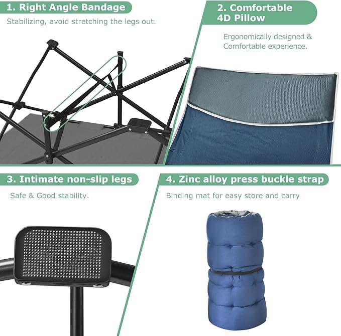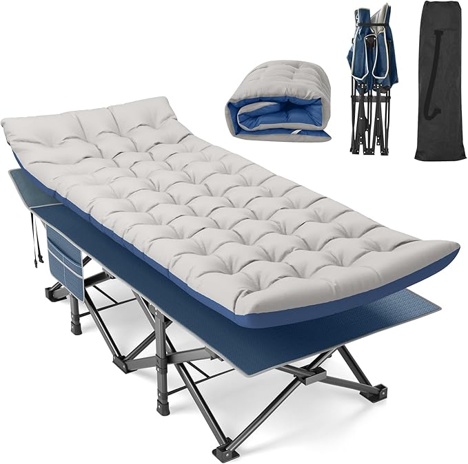 - 【Removable Skin-Friendly Mat】Our camping bed cot for adults has a soft and removable Mat, the 4" thicken cushion makes you more comfortable and warm when resting or sleeping. The cushion is made of skin-friendly and comfortable fabric, which is very suitable for people with sensitive skin or kids. You can also remove the mat when the weather is hot,and tie it up with the delivered zinc alloy buckle strap