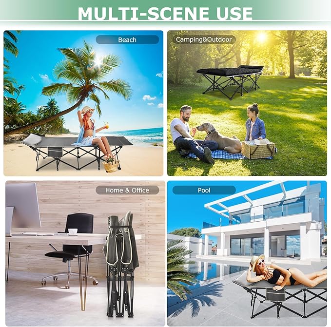 - 【Portable and Versatile】This folding cot free installation, it can be used when unfolded, and can be folded up in seconds, easy to put into the matching carrying bag for easy transport and storage. This camp cot has a large built-in side pocket to store your water bottle, phone, glasses, keys, books, toys and more. This is a great camping bed for adults and kids. Perfect for camping, road trips, beach, backyard, office naps and more