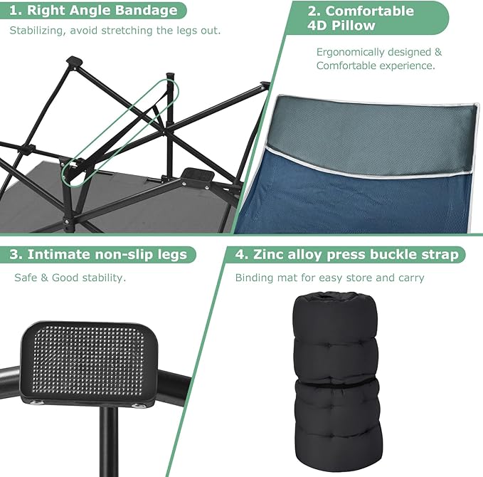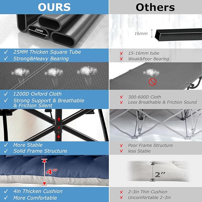 - 【Removable Skin-Friendly Mat】Our camping bed cot for adults has a soft and removable Mat, the 4" thicken cushion makes you more comfortable and warm when resting or sleeping. The cushion is made of skin-friendly and comfortable fabric, which is very suitable for people with sensitive skin or kids. You can also remove the mat when the weather is hot,and tie it up with the delivered zinc alloy buckle strap.
