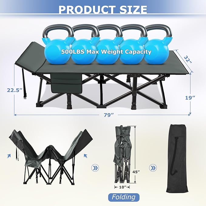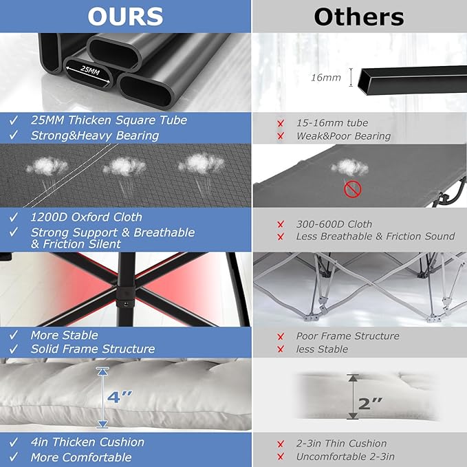 - 【Built-in Pillow Design】The headboard of our cot is a slanted design with built-in pillows, no need for extra pillows. The slight incline is ergonomically designed to ensure no more back, neck or shoulder pain in sleep! The mattress is also soft and thicker, so this is a very comfortable folding camping cot