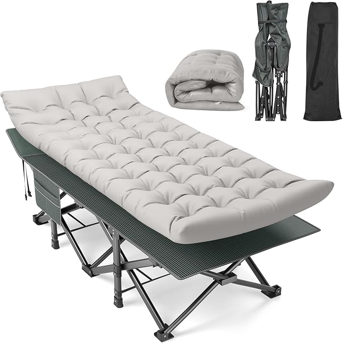 - 【Removable Skin-Friendly Mat】Our camping bed cot for adults has a soft and removable Mat, the 4" thicken cushion makes you more comfortable and warm when resting or sleeping. The cushion is made of skin-friendly and comfortable fabric, which is very suitable for people with sensitive skin or kids. You can also remove the mat when the weather is hot,and tie it up with the delivered zinc alloy buckle strap
