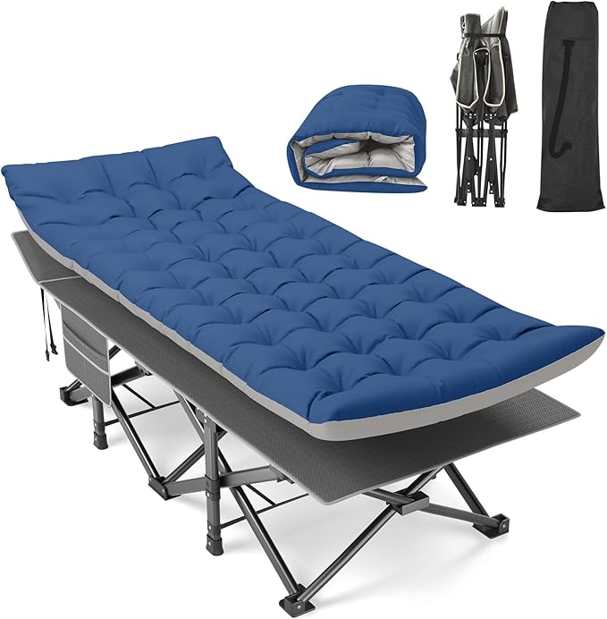 - 【Removable Skin-Friendly Mat】Our camping bed cot for adults has a soft and removable Mat, the 4" thicken cushion makes you more comfortable and warm when resting or sleeping. The cushion is made of skin-friendly and comfortable fabric, which is very suitable for people with sensitive skin or kids. You can also remove the mat when the weather is hot,and tie it up with the delivered zinc alloy buckle strap