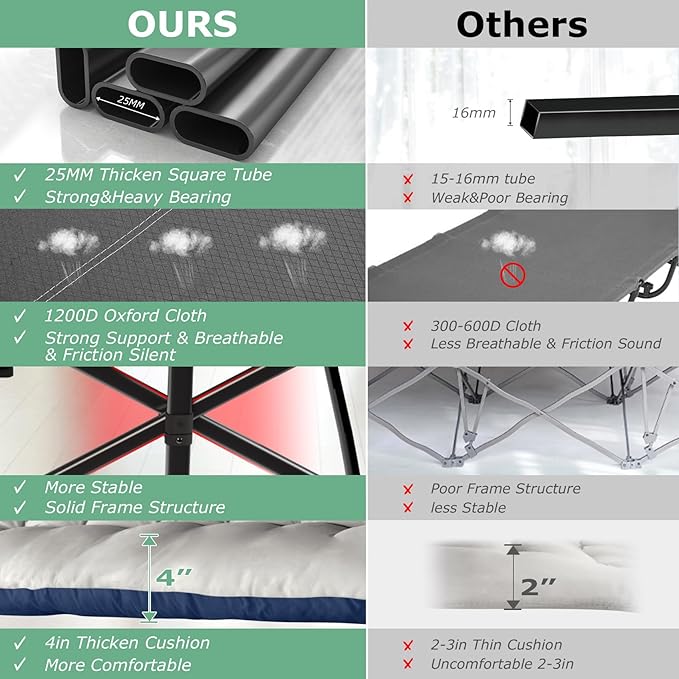 - 【Built-in Pillow Design】The headboard of our cot is a slanted design with built-in pillows, no need for extra pillows. The slight incline is ergonomically designed to ensure no more back, neck or shoulder pain in sleep! The mattress is also soft and thicker, so this is a very comfortable folding camping cot
