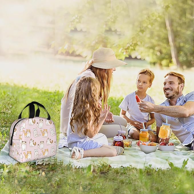 Cute Cartoon Cat Pink Lunch Box,Insulated Lunch Bag for Girls Boys,Reusable Lunch Box for Kids Adults School Student Work Picnic Travel