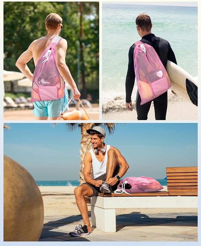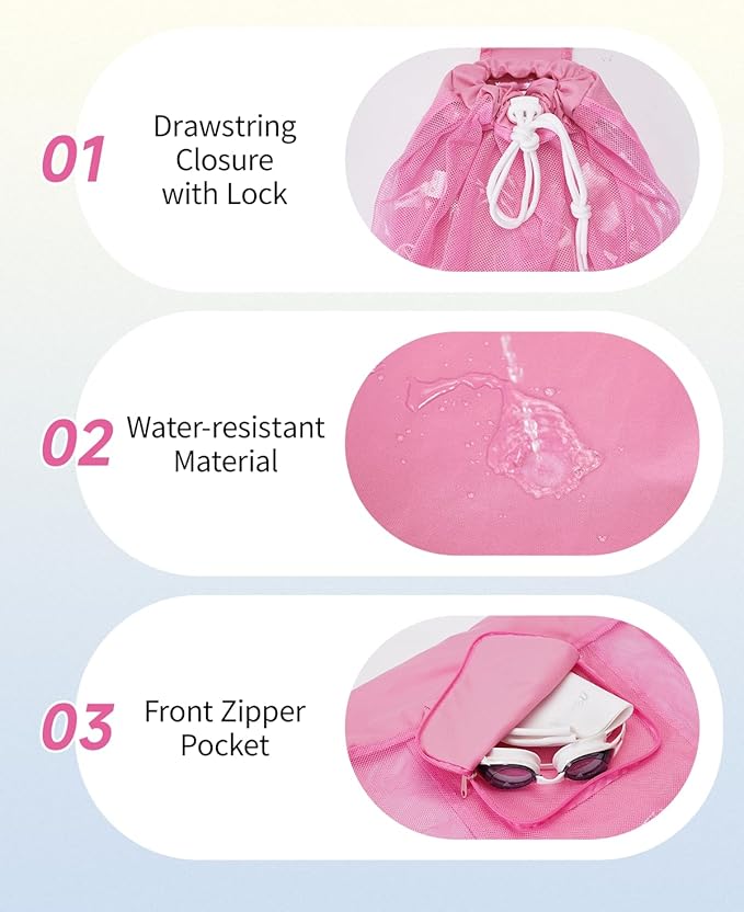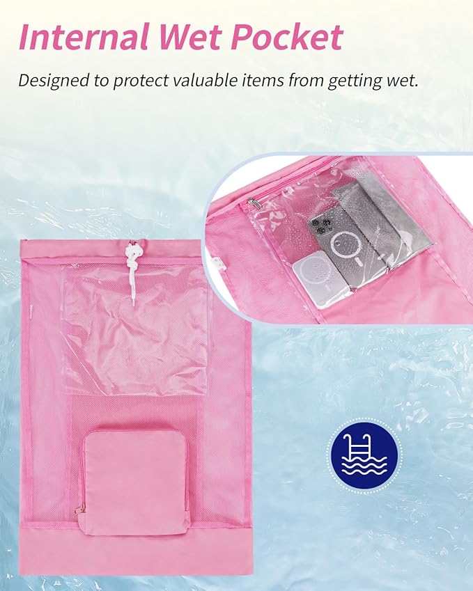 - 【Breathable Mesh】: The non-mesh parts of the mesh backpack are made from water-resistant Oxford fabric, while the mesh pocket is constructed from tear-resistant material. It dries quickly and allows sand to fall off easily, keeping wet towels breathable inside the wet bag for swimsuit.