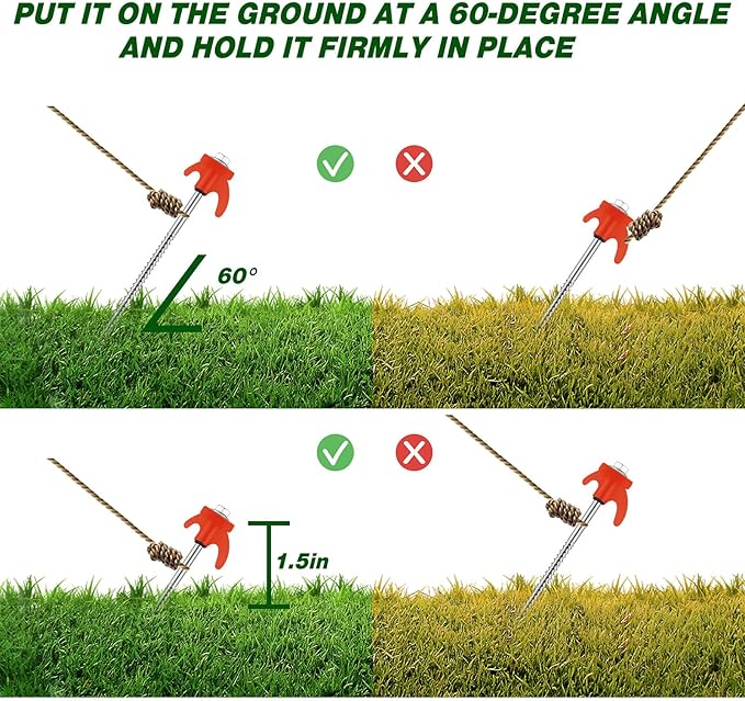 - Easy to Use: our threaded tent stakes have pointed tips that are easy to insert into hard soil, and the spiral design offers a strong grip; With the help of a cordless drill or impact driver, these tent spikes will have your tents, canopies, gazebos, awnings, guy lines, picnic mats, or tarps grasp the ground in a second; Tips: not suitable for soil with hard rocks or heavy roots, as this may cause damage to the anchor or overload of the cordless drill