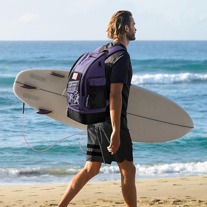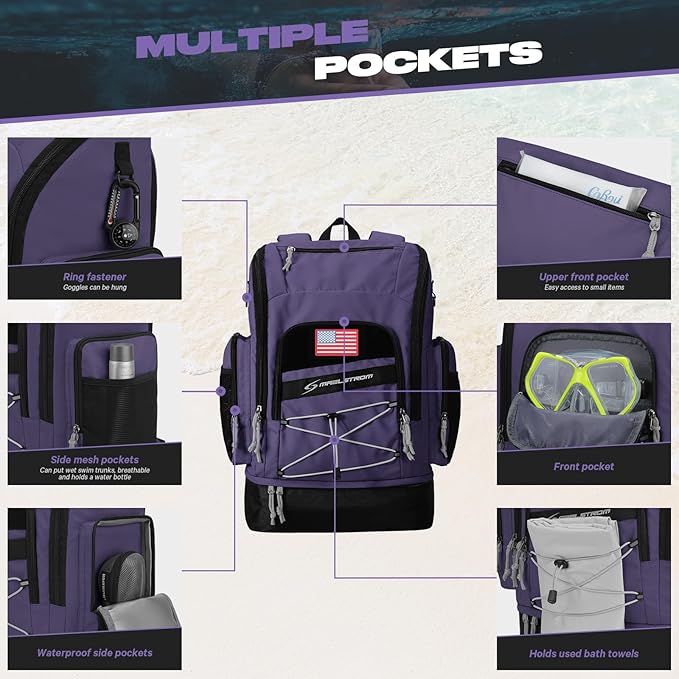 • Waterproof & Spacious: Our swimming backpack is crafted from upgraded waterproof polyester, ensuring durability against water and wear. With a generous 35L capacity, it accommodates all your swimwear, activewear, and training gear.