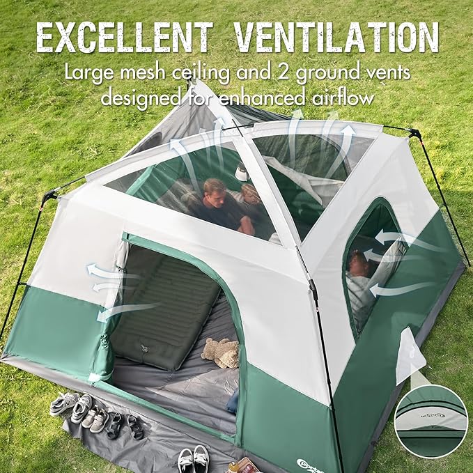 - Roomy Interior & 76" Tall: Measuring 10' x 9' x 76", this 6 person tent fits 2 queen size air mattresses or 6 sleeping bags. The 76" center height ensures enough space for standing and comfortable movement inside the tent.