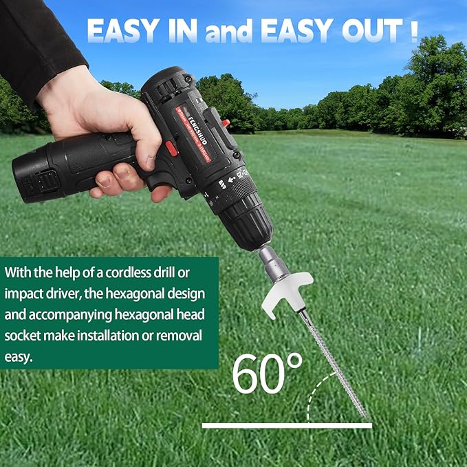 - Easy In And Easy Out: With the help of a cordless drill or impact driver, the hexagonal design and accompanying hexagonal head socket make installation or removal easy. LISMODZ camping stakes are easy to drive in and haven't budged! Very easy to put in rocky soil