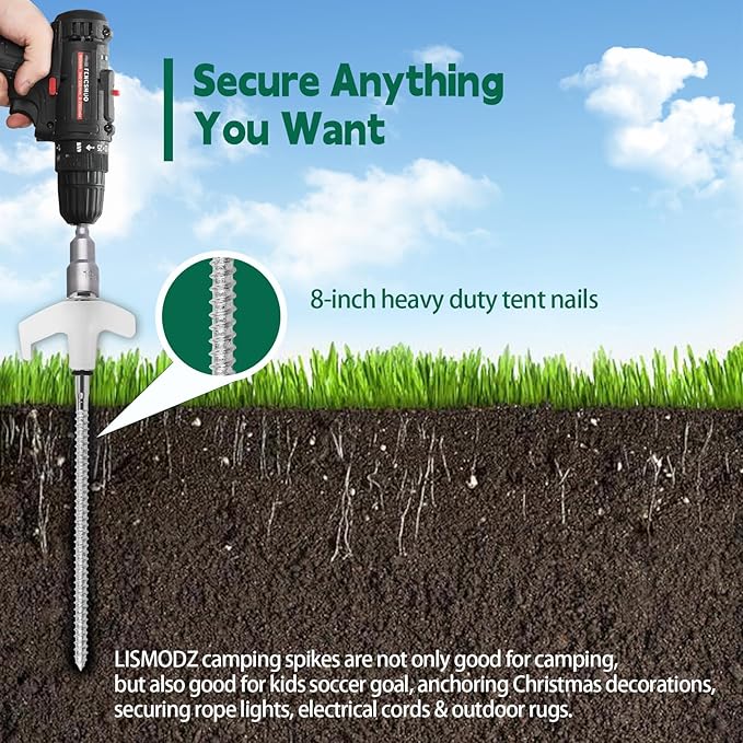 - Secure Anything You Want: LISMODZ camping spikes are not only good for camping, but also good for kids soccer goal, anchoring Christmas decorations, securing rope lights, electrical cords & outdoor rugs