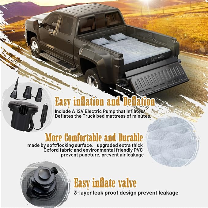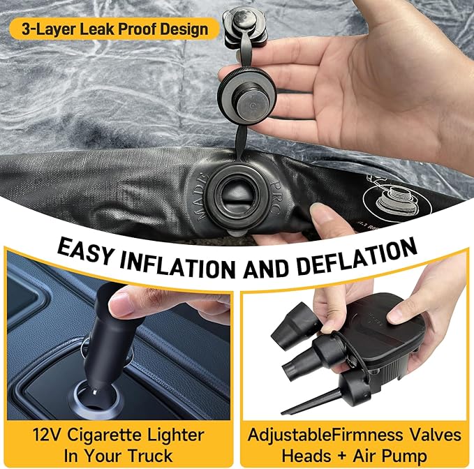 - High-Quality Materials: Our inflatable truck bed air mattress features a plush soft-flocked top surface, durable PVC construction for robust support, and upgraded 2024 extra-thick 210T grid fabric on the bottom to prevent punctures and air leakage, enhancing durability and reliability.