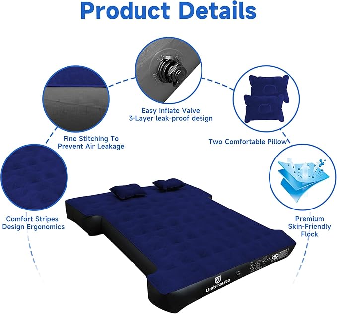 - High Quality Material: The top of the Umbrauto truck bed air mattress is made from soft flocking material, while the bottom is made from 2024 upgraded extra-thick Oxford fabric and environmentally friendly PVC, preventing punctures and air leakage.