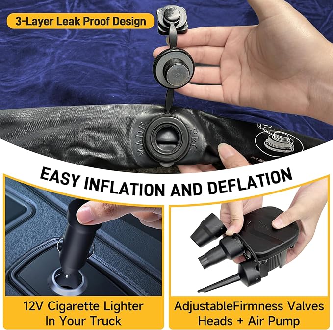 - Easy Inflation and Deflation: Simply plug into your 12V cigarette lighter for effortless inflation and deflation using the included air pump. The triple-layer air valve ensures excellent airtightness, preventing leaks effectively.