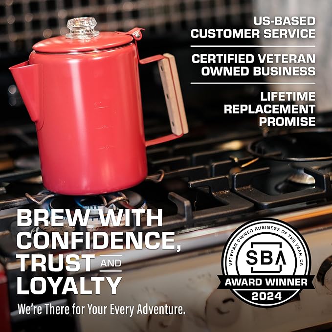 - LIFETIME REPLACEMENT GUARANTEE: Top materials & workmanship enable a superb promise. Shop with confidence. This is the last camping percolator coffee pot you will ever need. US based customer service