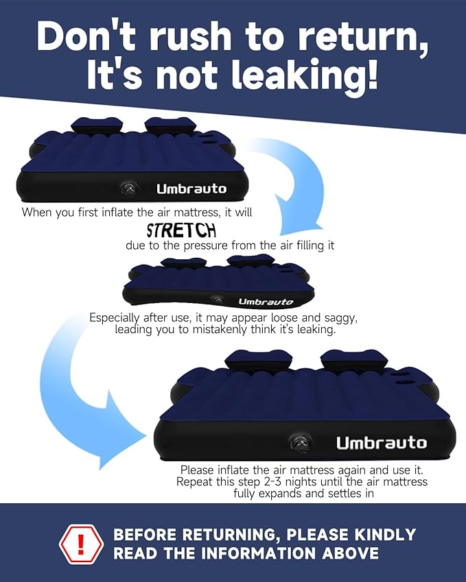 - Don't Rush to Return!: When people first use air mattress, they may mistakenly think it is leaking because it stretches due to the pressure of air filling it. Please inflate the mattress to full again to allow it to expand. Repeat this process for 2-3 nights until the air mattress fully expands and settles in.