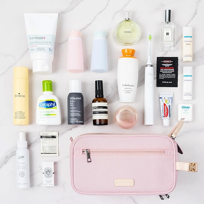 - BEST TRAVEL TOILETRIES BAG: Our womens makeup bag has built-in clip-on buckle that lets you hang it wherever you need it. Keeping your cosmetics and skincare essentials organized and within reach in hotel, gym, bathrooms or showers during your travel. Its compact size easily fits in carry-on or backpack, making it the ideal travel accessory for women on the go.