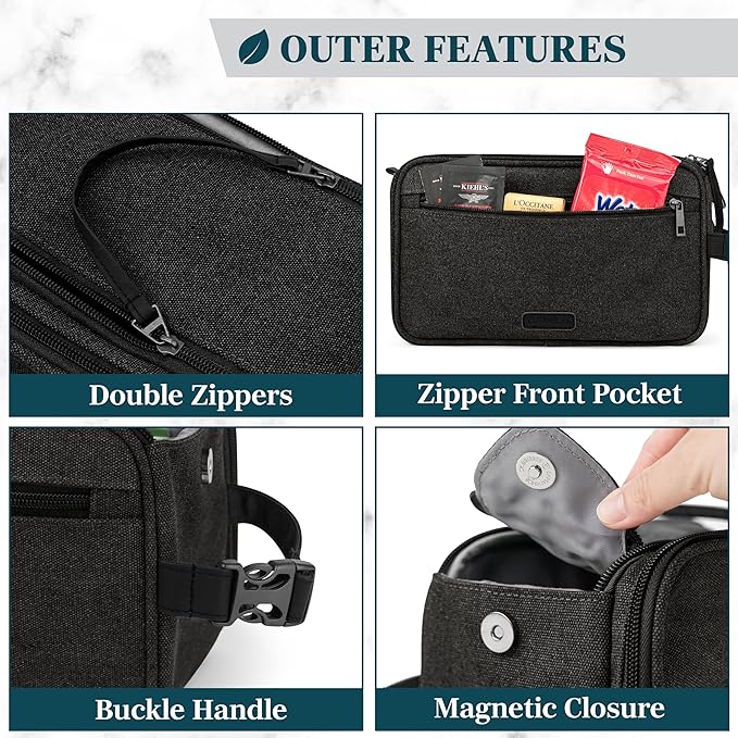 - TOILETRY BAG FOR MEN & WOMEN: Mens toiletry bag is more than just a dopp kit bag! This large-capacity canvas toiletry bag has a full-open front zipper pocket that includes elastic bands and multiple compartments to keep everything organized.