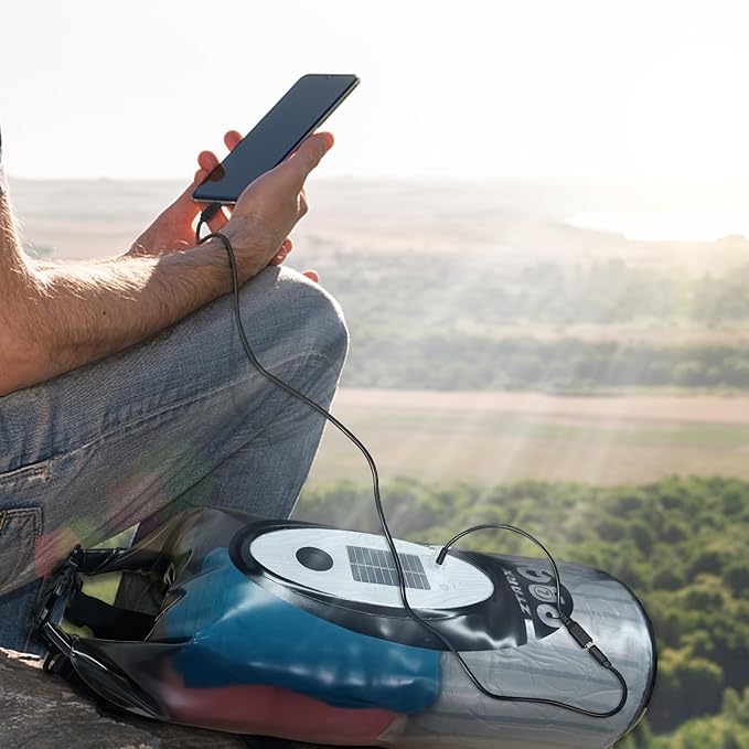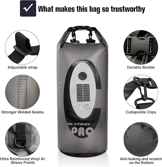 - Solar Powered and USB Powered Waterproof Bag: You could charge floating waterproof camera bag under direct sunshine through the solar board, or use the micro USB port to charge waterproof dry bag through mobile charger. (Note: Cable included, charger not included) Flexible charging method will bring you much convenience when the dry bag is used in the outdoors.
