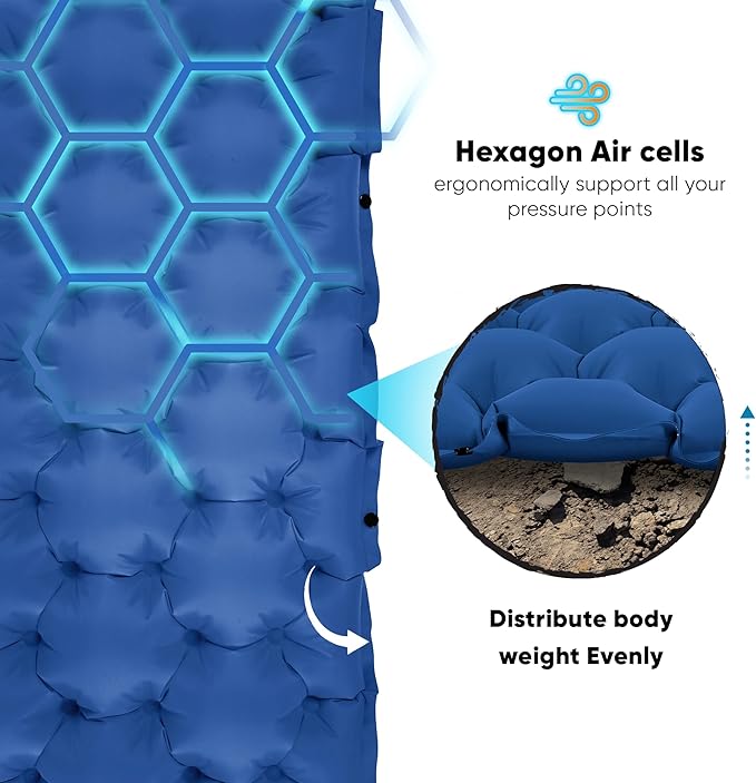 - Sleep Soundly All Night Long: The hexagon air cells and one-piece pillow ergonomically support all of your pressure points, delivers superior support and comfort all night long, no matter how you sleep – on your side, stomach or back! This comfy sleeping pad for camping 2 person is also a camping gear must haves luxury, being comfortable yet lightweight. It's super versatile, an ultralight camping sleeping mat, 2 person cot, tent carpet, car mattress, picnic mat etc, works perfect for family or couple camping trip.