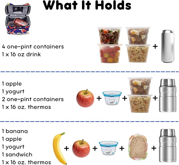 - What It Holds — Insulated lunch box holds a 12-16 oz drink, a yogurt cup, a fruit cup, a small cottage cheese container, an apple, and 2 frozen gel packs