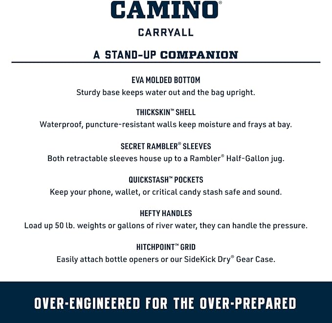 • MULTIPLE WAYS TO CARRY: The Camino 20 Carryall is a heavy-haulin’, up-for-anything tote. Throw it over your shoulder or pick it up by the CrossBar Handles. Whichever way you choose this bag pulls its weight, so you can carry on with your day.