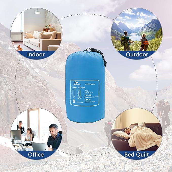 - 【WARM & COMFORTABLE】This camping backpack waterproof sleeping bag provides 68°F of warmth in the summer and can be used as a bag liner to increase the warm temperature of the sleeping bag by 50°F in the other three seasons.