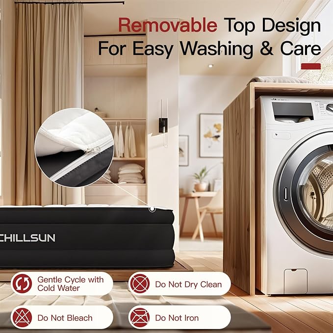- Waterproof and Washable: The CHILLSUN 18" Raised Queen Air Mattress is waterproof, protecting against spills and accidents. It can be disassembled and machine-washed to maintain hygiene and extend its lifespan, ensuring easy care for users