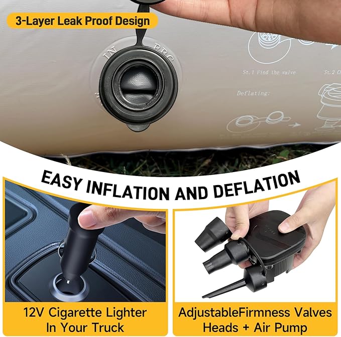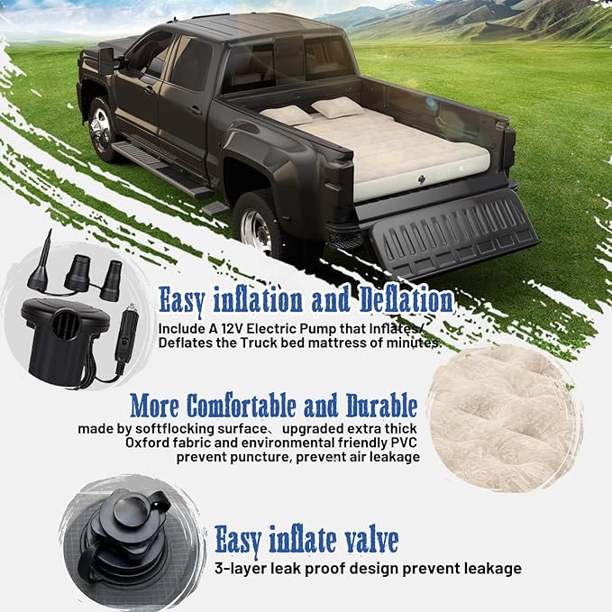 - High-Quality Materials: Our inflatable truck bed air mattress features a plush soft-flocked top surface, durable PVC construction for robust support, and upgraded 2024 extra-thick 210T grid fabric on the bottom to prevent punctures and air leakage, enhancing durability and reliability.