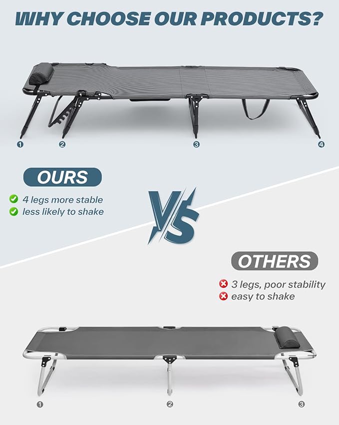 - PORTABLE AND VERSATILE: This folding chair cot bed free assembly, it can be unfolded for use, and can be folded up in 10 seconds. The folding design is easy to store and carry. Ideal for camping, patio relaxation, poolside lounging, balcony leisure, beach outings, travel, office naps, sunbathing, road trip, or as a convenient guest bed when guests visit your home. Enjoy the convenience and versatility it brings to your lifestyle with our cot!