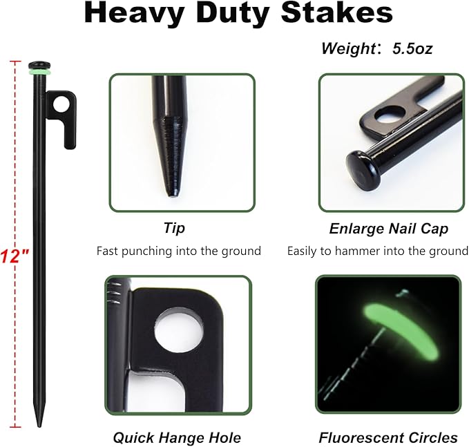 - 【Value Tent Stake Kit】Package come with 10pcs of 12in metal tent stakes(Diameter 3/8", weight 5.4oz), 10pcs fluorescent rubber rings, 1pc storage pouch.