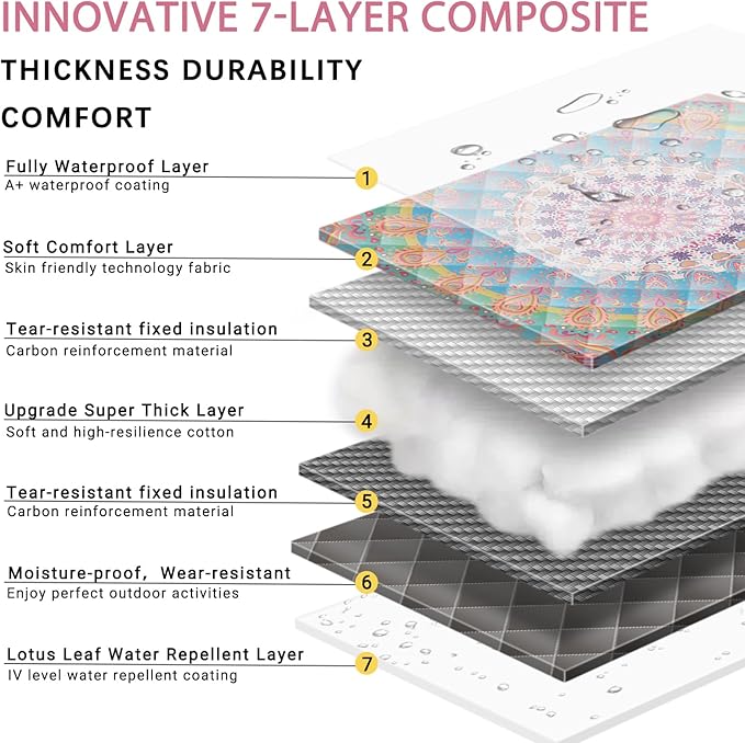 - [7-Layer Structure]This picnic mat features an advanced 7-layer structure design, with a soft cotton layer in the middle that provides excellent cushioning. This ensures a comfortable sitting and lying experience during outdoor activities. Whether you're on grass, sand, or using it indoors, it offers ample support.