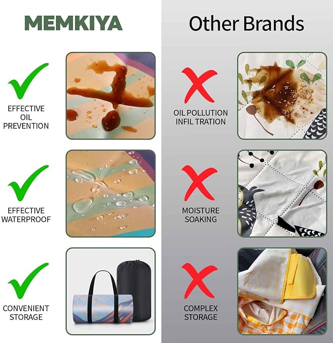 - [Dual-Sided Protection]The standout feature of this picnic mat is its dual-sided protection design. The top side is coated with a patented water-resistant and oil-repellent film, which not only provides water resistance but also effectively repels oil stains. The bottom side is made from high-quality Oxford fabric, offering superior water resistance and preventing sand, dirt, and grass debris from seeping through.