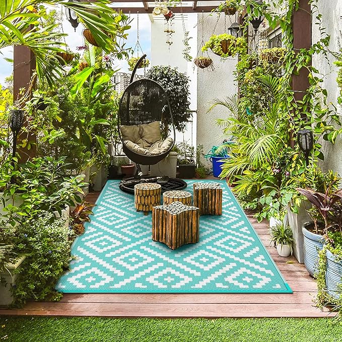 GENIMO Outdoor Rug for Patio Clearance, 6'x9' Waterproof Camping Mat, Reversible Plastic Straw Rugs for RV, Camper, Balcony, Backyard, Picnic, Deck (Aqua Blue & White)