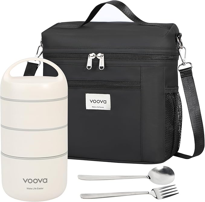 Voova Stackable Stainless Steel Thermal Lunch Box with Lunch Bag and Cultery Set for Adult Women Men, 3 Tier Leakproof All-in-One Insulated Bento Boxes Food Container for Work, Black