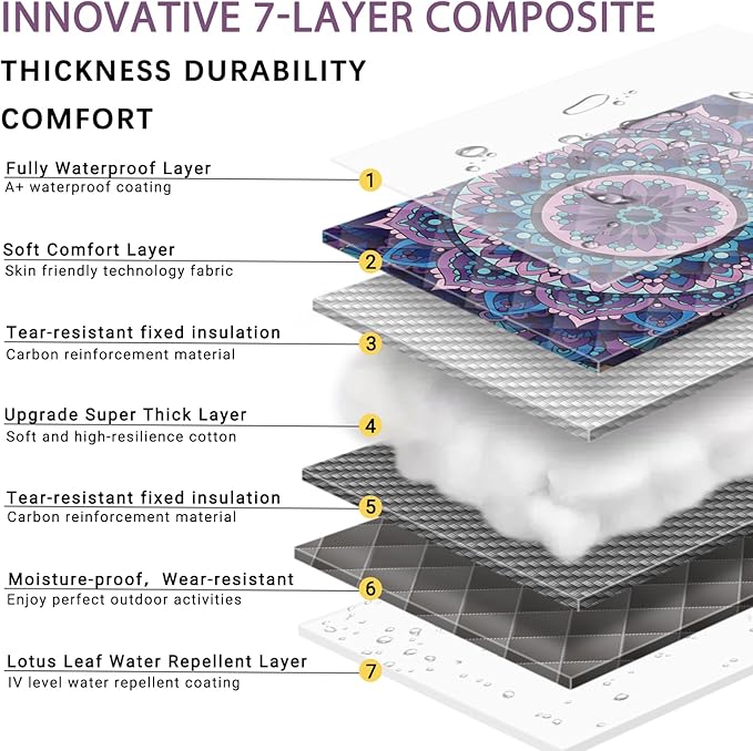 - [7-Layer Structure]This picnic mat features an advanced 7-layer structure design, with a soft cotton layer in the middle that provides excellent cushioning. This ensures a comfortable sitting and lying experience during outdoor activities. Whether you're on grass, sand, or using it indoors, it offers ample support.
