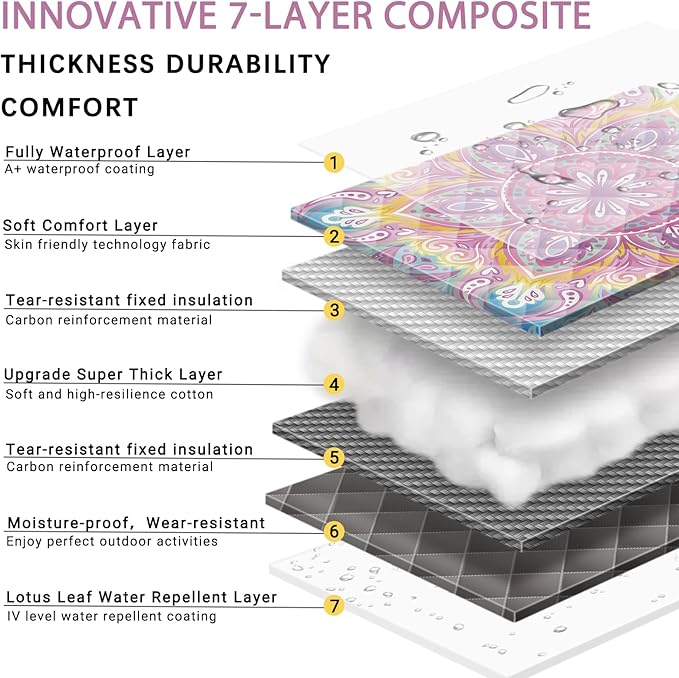 - [7-Layer Structure]This picnic mat features an advanced 7-layer structure design, with a soft cotton layer in the middle that provides excellent cushioning. This ensures a comfortable sitting and lying experience during outdoor activities. Whether you're on grass, sand, or using it indoors, it offers ample support.