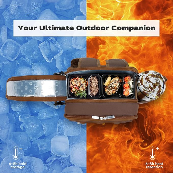 - LARGE CAPACITY & WELL EQUIPPED: Size: 12(L)x7.5(W)x15(H) inches, 5.2 lb; The 22L high-capacity picnic backpack big enough to accommodate the ingredients needed for a picnic. Includes a full set of camping accessories: backpack cooler, picnic blanket, wine bag, cutlery and cutting board, etc. The camping backpack bag is made of 100% polyester fabric and 5mm PE foam and PU layer, which can keep the hot/cold/fresh for hours.