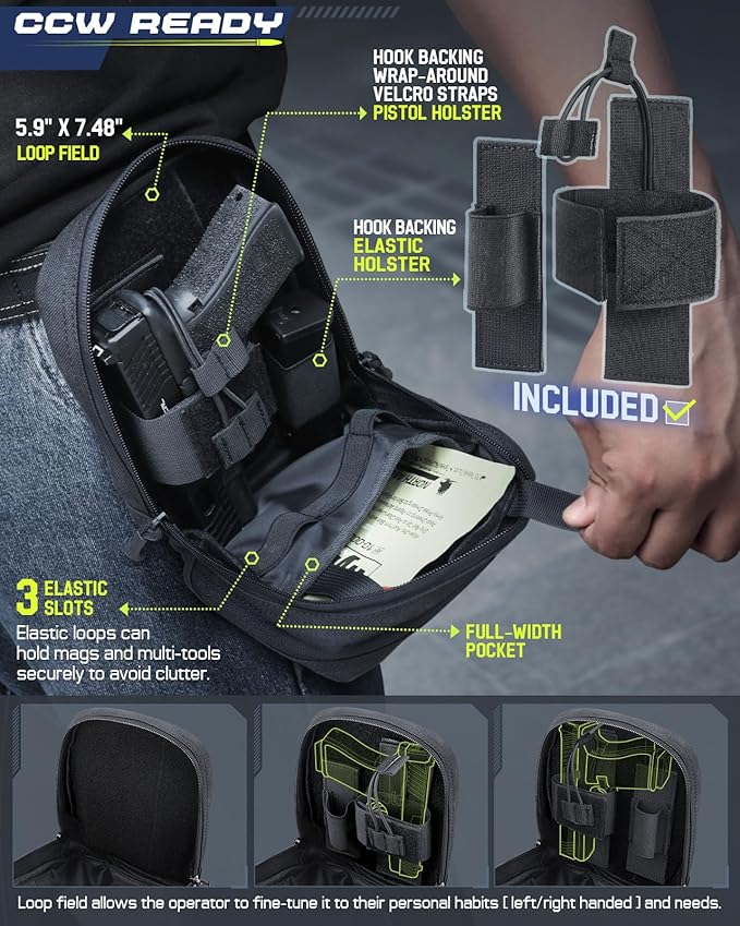 - CONCEALED CARRY A PISTOL: Molle Admin Pistol Pouch has a main compartment offers more organization options with its loop field and classic EDC layout that you can customize to fit entire loadout. On one side of loop field(5.9"x7.48"/15*19cm), it is equipped with removable pistol/elastic holster. On the other side, a wide pocket with three elastic loops in front of it for organizing items in sections to avoid clutter.