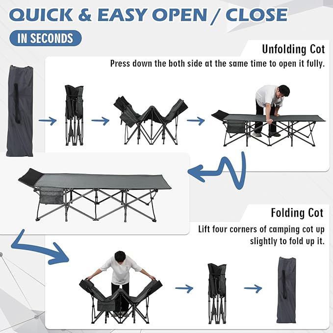 - Premium Material & Stable Structure: Our portable cot bed is constructed in double-layer oxford cloth to offer superior strength, which is wear resistance and easy cleaning. Because of selected and premium fabric, using our camping cot silently without squeak when rolling over at resting time. Besides, our folding cot is equipped with high-strength steel tube, supporting up to 700lbs, and also features X-shape structure to enhance stability, it can carry 1 adult or 2 children sleeping or resting on it.