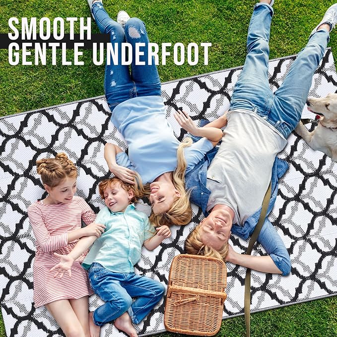 - Gentle Underfoot & Relaxing: The woven plastic straws create a soft, comfortable surface, perfect for barefoot walking and relaxation. Whether you're lounging on your patio or enjoying a picnic, this outdoor carpet for patio enhances your outdoor experience.