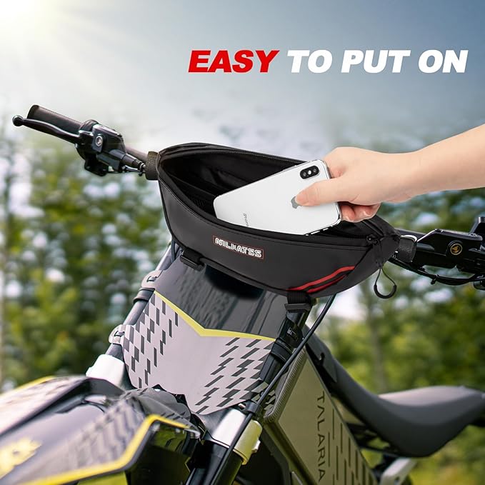 - 【Fitment】 This bag is designed to fit the unique handlebar shapes of Sur-Ron and Segway electric dirt bikes, ensuring a secure and stylish fit. It features a universal buckle compatible with most motorcycles, and customers have found it also fits the KLX 110 / 400, 50cc youth bike, walk-behind brush hog, 99 Scrambler, and more. It's versatile for various vehicles beyond bikes and scooters