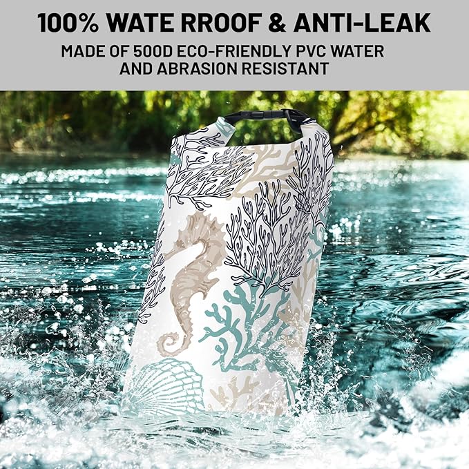 - Adjustable Carrying Options: Available in 5L and 10L with a removable shoulder strap for cross-body carry, or a 20L version featuring two adjustable straps for backpack-style comfort.Roll-top closure system provides secure watertight seal, keep your gear dry in any wet situation.Unique Nautical Ocean Theme Seahorse design dry bag backpack Carry it your way!