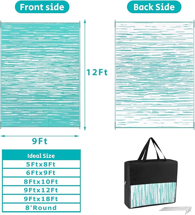 - Extra Large Reversible Outdoor RV Mats 9x12: The XXL large 9X12 ft outdoor porch rug with unique striped design, which makes it easy to use on patio,camper, deck, beach, backyard. And this outside camping rug is reversible, two-sided design allows you to have two different looks.